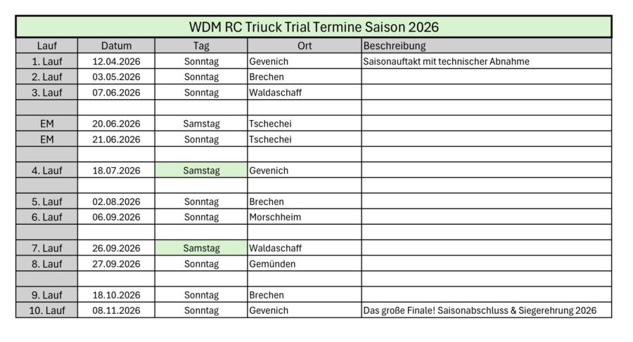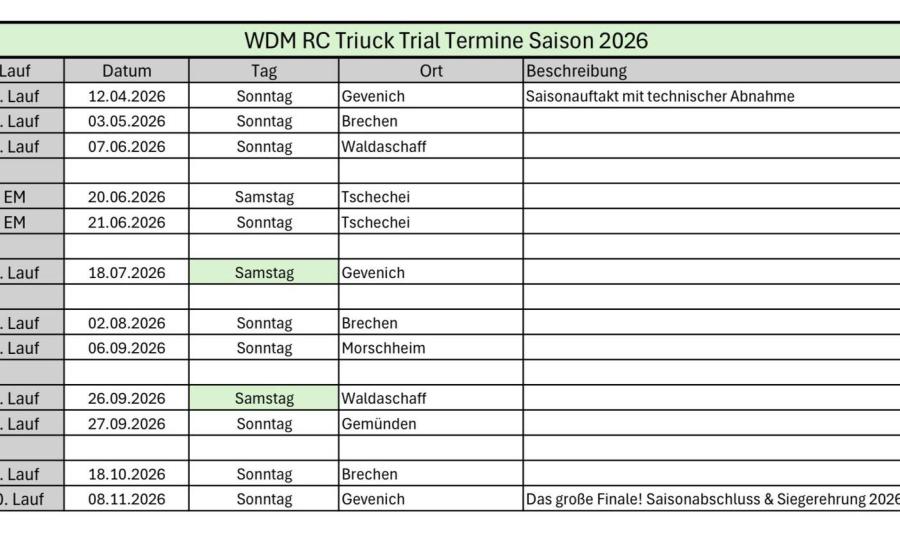 Hallo Zusammen wie geht es euch so? Die Planungen sind – wie der ein oder andere bereits auf der Webseite gesehen hat – abgeschlossen. In dieser Saison haben wir 10 Läufe für die Meisterschaft angesetzt. An dieser Stelle möchten wir uns wie immer herzlich bei allen Streckenbetreibern bedanken, die sich bereit erklärt haben, unsere Läufe auszutragen. Das macht uns sehr stolz – vor allem, weil viele Strecken bereits seit Jahren oder sogar Jahrzehnten mit uns zusammenarbeiten. Diese Kontinuität ist alles andere als selbstverständlich. Am Regelwerk hat sich im Vergleich zum letzten Jahr nichts geändert. Der Grund dafür ist erfreulich: Wir sehen aktuell keinen notwendigen Verbesserungsbedarf. Neu eingeführt haben wir in dieser Saison jedoch einen Scale-Faktor. Besonders scalig gebaute LKWs erhalten dadurch einen kleinen Punktebonus. Dafür haben wir einen eigenen Scale-Katalog entwickelt, den wir in diesem Jahr erstmals einsetzen werden. Wir sind gespannt, wie sich dieses neue System in der Praxis bewährt. Die Europameisterschaft wird in diesem Jahr wieder von unseren Freunden aus Tschechien ausgetragen. Dieses Event ist wie jedes Jahr sicherlich ein Highlight der Saison. Ein weiteres besonderes Highlight 2026: Wir wurden vom originalen Europa Truck Trial (1:1) eingeladen, ein Showfahren am Lausitzring durchzuführen. Damit werden auf derselben Strecke sowohl originale Truck-Trial-Fahrzeuge als auch unsere wunderschönen RC-Truck-Trial-Fahrzeuge am Start sein. Wir freuen uns riesig auf dieses Event! Besonders schön ist außerdem, dass wir dort gemeinsam mit nahezu allen Gruppen, die das RC-Truck-Trial-Hobby in Deutschland betreiben, fahren werden. Das ist eine tolle Möglichkeit zum Austausch und um unser gemeinsames Hobby weiter voranzubringen. Alle Events könnt ihr wie gewohnt auf unseren YouTube-Kanälen verfolgen. Seid gespannt – und bleibt unserem großartigen Hobby treu! In diesem Sinne Gruß Gregor und Andy
